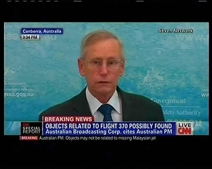 ??? 澳方稱在印度洋中發(fā)現(xiàn)了可能與馬航失聯(lián)客機(jī)有關(guān)物體這張3月20日拍攝的CNN視頻截圖顯示,澳大利亞海事安全局官員在堪培拉召開的新聞發(fā)布會(huì)上發(fā)言(左圖為相關(guān)搜尋海域的示意圖)。澳大利亞總理阿博特當(dāng)日在議會(huì)說,澳方在印度洋中發(fā)現(xiàn)了可能與馬航失聯(lián)客機(jī)有關(guān)的兩個(gè)物體。澳大利亞海事安全局官員當(dāng)日說,發(fā)現(xiàn)可疑碎片的位置與之前確定的馬航失聯(lián)客機(jī)南部搜尋航道高度吻合,但當(dāng)?shù)睾S蛩沫h(huán)境非常差。新華社發(fā)