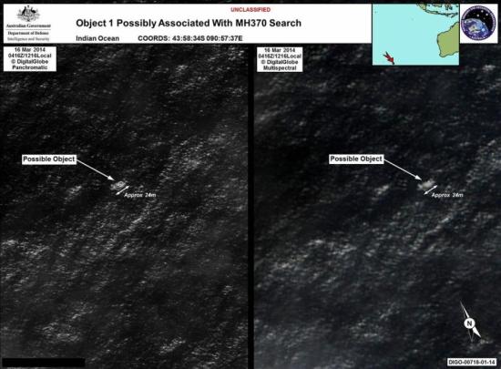 澳大利亞海事安全局20日在“推特”上公布了發(fā)現(xiàn)疑似與馬航失聯(lián)客機有關的物體的衛(wèi)星圖像。在圖像中,澳方標明,其中一件物體長約24米,另一件長約5米。衛(wèi)星是在3月16日抓取的這一圖像。圖片來源:澳大利亞海事安全局