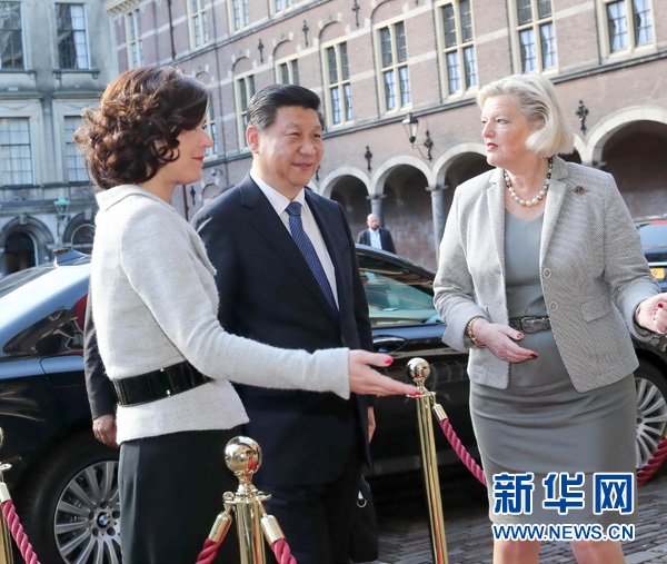 ????3月24日,國家主席習近平在海牙會見荷蘭議會一院議長布勒克-克諾爾(右)和二院議長范米爾滕伯格。 新華社記者 劉衛(wèi)兵 攝