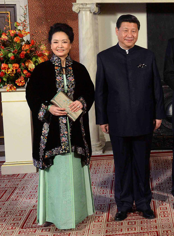 ——在出席威廉-亞歷山大國王舉行的國宴時,習主席與夫人彭麗媛都以中式服裝亮相。習主席穿著的中式服裝色彩飽和,略帶暗光澤,頗具莊嚴感;高密度高支紗的面料讓人感覺嚴謹與厚重;在設(shè)計上,暗門襟的設(shè)計將前胸的紐扣都隱藏起來,沉穩(wěn)大氣,淡去人們對于中山裝的記憶。頗具巧思的是左前胸呼應(yīng)西裝口袋巾的圖案設(shè)計,體現(xiàn)出對西方禮儀的尊重,也營造出輕松和諧的氛圍。彭麗媛穿著的是牡丹花刺繡的外套,內(nèi)搭粉果綠的長裙,長裙很具有清新感,內(nèi)藏著對綠色環(huán)保的崇尚。中國刺繡素來被西方人所崇尚,牡丹花自古被視為中國的國花,頗具傳統(tǒng)風格的粉果綠色彩,給人以清新感,同時內(nèi)藏對綠色環(huán)保的崇尚。整套服裝具有很鮮明的中國特色,非常符合中國人的審美觀,又符合西方時尚,并且廓形感很強。