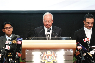 新聞發(fā)布會開始,一臉嚴(yán)肅的納吉布說,他當(dāng)天傍晚得到英國空難調(diào)查處代表的通報。根據(jù)后者的通知,先前提供衛(wèi)星數(shù)據(jù)以指出南北兩條搜救走廊的國際海事衛(wèi)星組織已經(jīng)根據(jù)數(shù)據(jù)實施了進(jìn)一步的計算。