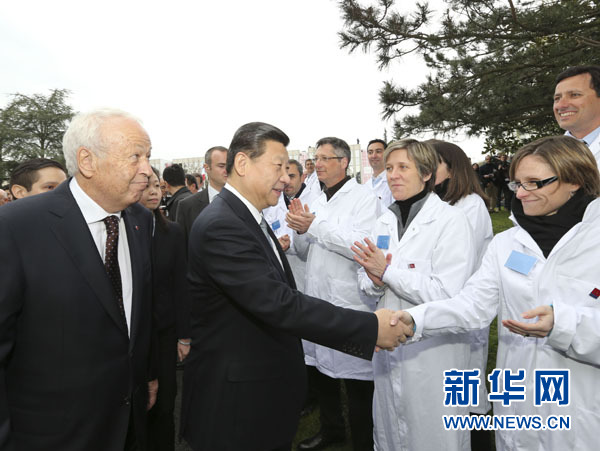 習近平和夫人彭麗媛抵達時,梅里埃集團總裁阿蘭·梅里埃率家族成員以及該中心員工列隊熱烈歡迎。法國政府外長法比尤斯、高教部長菲奧拉索陪同參觀。