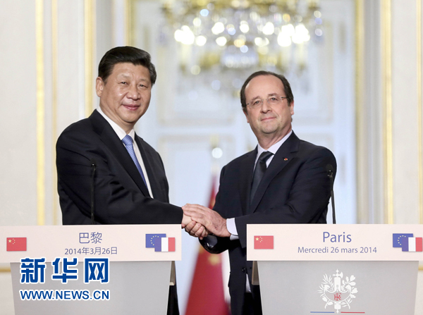 ????兩國元首還共同會見了記者。習(xí)近平表示,50年前,中法兩國沖破層層阻隔,實現(xiàn)歷史性握手,在國際關(guān)系史和東西方交流史上寫下濃墨重彩的一筆。這一歷史性事件體現(xiàn)出的互尊互信、平等相待、開放包容、互利共贏精神,至今仍具有重要時代意義。我同奧朗德總統(tǒng)共同規(guī)劃了兩國關(guān)系發(fā)展的方向和重點,決定將發(fā)展中法關(guān)系作為各自外交優(yōu)先取向。我們要攜手合作,共同開創(chuàng)緊密持久的中法全面戰(zhàn)略伙伴關(guān)系新時代,繼續(xù)引領(lǐng)中歐關(guān)系和中國同西方國家關(guān)系發(fā)展。我對中法友好的未來發(fā)展更加充滿信心。