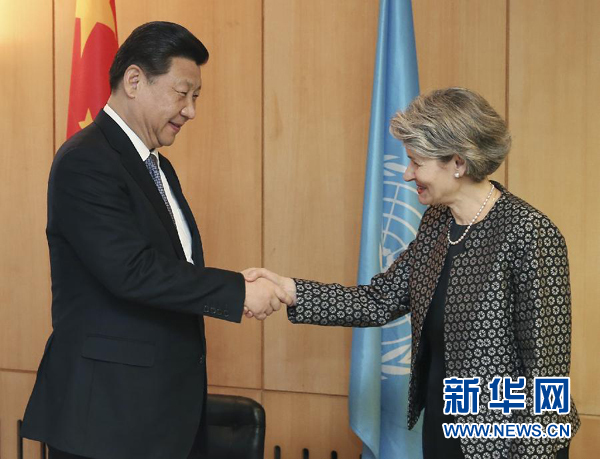????新華網(wǎng)巴黎3月27日電(記者尚栩 劉華)國(guó)家主席習(xí)近平27日在巴黎聯(lián)合國(guó)教科文組織總部會(huì)見該組織總干事博科娃。