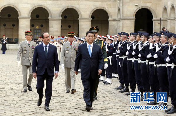 ??? 據(jù)新華社“新國(guó)際”微博3月27日?qǐng)?bào)道,法國(guó)總統(tǒng)奧朗德26日下午在巴黎榮軍院廣場(chǎng)舉行盛大儀式,歡迎中國(guó)國(guó)家主席習(xí)近平。打破常規(guī)在榮軍院舉行歡迎儀式,奧朗德總統(tǒng)一路陪同,146名騎兵左右護(hù)衛(wèi) ......隆重的禮儀,盡顯東道主的熱情和尊重。