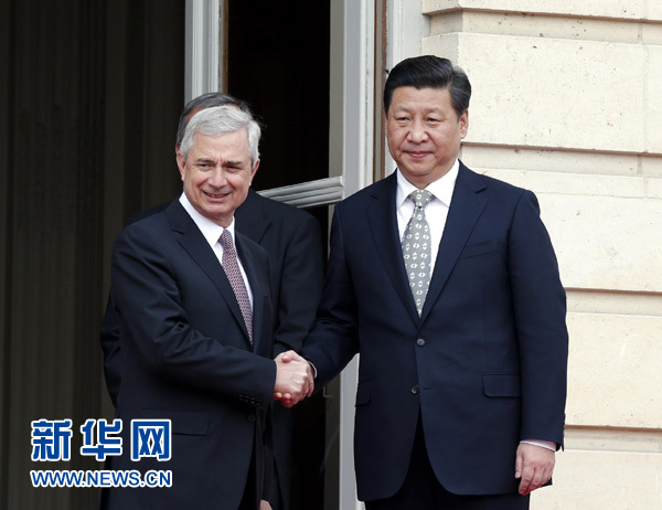 ????習(xí)近平表示,在中法建交50周年之際,我和奧朗德總統(tǒng)共同決定開(kāi)創(chuàng)緊密持久的中法全面戰(zhàn)略伙伴關(guān)系新時(shí)代。中法關(guān)系站在新的歷史起點(diǎn)上,前景更加廣闊。雙方要以剛剛發(fā)表的中法聯(lián)合聲明為指引,筑牢政治、經(jīng)濟(jì)、人文三大支柱,推動(dòng)中法關(guān)系取得新的更大發(fā)展。