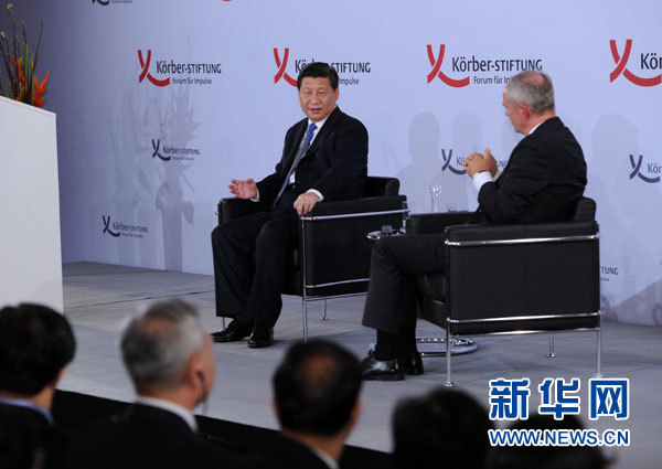 ??? 這是演講結(jié)束后習(xí)近平主席回答科爾伯基金會常務(wù)副主席魏邁爾的提問。新華社記者 饒愛民 攝