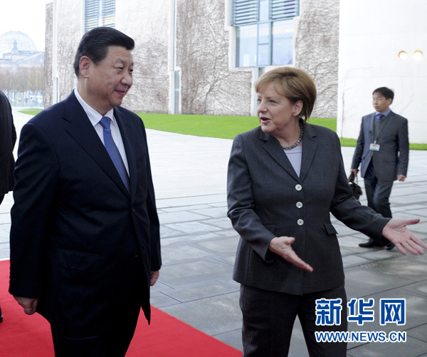 ????新華網(wǎng)柏林3月28日電(記者陳贄 錢彤 唐志強)國家主席習近平28日在柏林同德國總理默克爾舉行會談。雙方就中德關(guān)系及共同關(guān)心的重大國際和地區(qū)問題深入交換意見,達成重要共識,決定將兩國關(guān)系提升為全方位戰(zhàn)略伙伴關(guān)系,為中德關(guān)系發(fā)展進一步確定了方向。