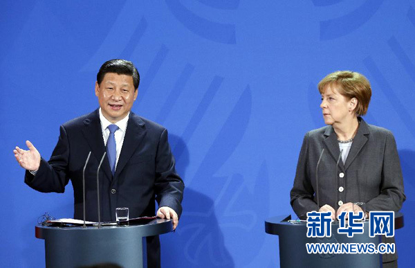 ????兩國領(lǐng)導(dǎo)人還共同會見了記者。習近平指出,中德關(guān)系發(fā)展到今天,兩國務(wù)實合作的效應(yīng)不再是簡單的一加一等于二,而是遠遠大于二。深化中德合作,利在兩國,惠及歐洲和世界。我這次訪問期間,雙方?jīng)Q定將兩國關(guān)系提升為全方位戰(zhàn)略伙伴關(guān)系,并簽署了多項合作協(xié)議。中德關(guān)系站在新起點上,面臨新的發(fā)展機遇。相信到2020年,歐洲的德國和亞洲的中國,經(jīng)濟實力將更強大,互利合作將更緊密,在國際事務(wù)中的影響將進一步提高。