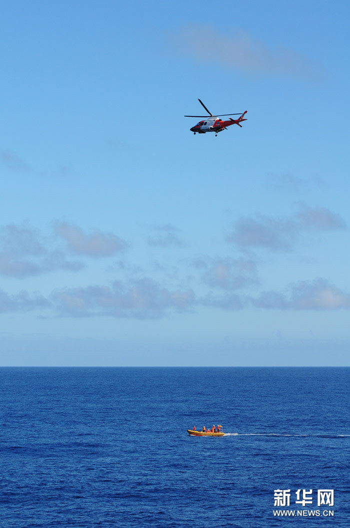 ????3月29日上午,在南印度洋,“海巡01”輪的船載直升機(jī)和小艇在疑似水域進(jìn)行搜尋。