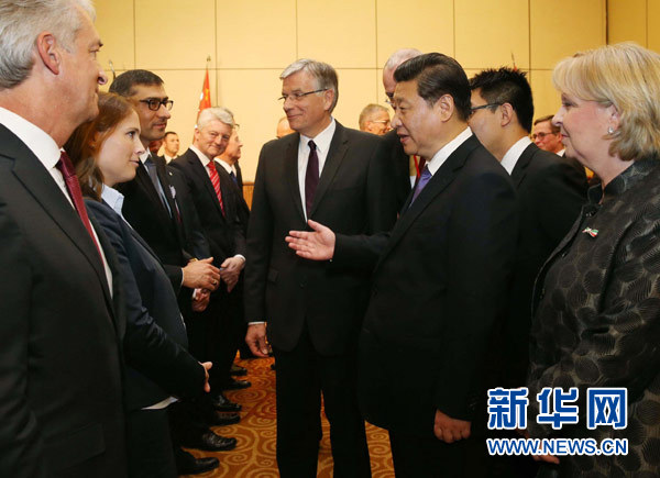 ????招待會開始前,習(xí)近平會見了中德企業(yè)家代表,勉勵兩國企業(yè)抓住機遇,共同做大中德合作。