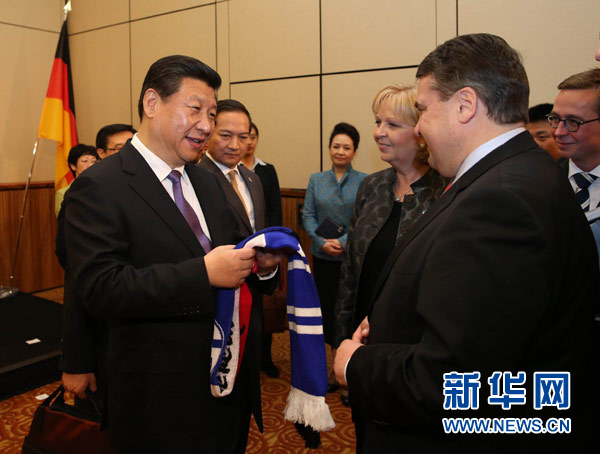 ??? 3月29日,中國國家主席習近平在杜塞爾多夫出席中德工商界舉行的招待會并發(fā)表題為《把握中國機遇,實現(xiàn)共同發(fā)展》的重要講話。這是招待會開始前,習近平在會見中德企業(yè)家代表時,德國副總理兼經(jīng)濟和能源部長加布里爾(前右)向習近平贈送一家德國足球俱樂部球迷標志性圍巾。新華社記者劉衛(wèi)兵攝