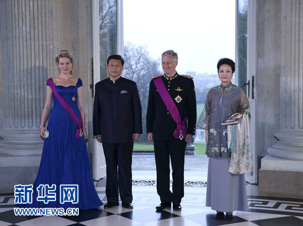 ????3月31日晚,比利時(shí)國(guó)王菲利普在布魯塞爾拉肯宮舉行隆重國(guó)宴歡迎國(guó)家主席習(xí)近平到訪。習(xí)近平和夫人彭麗媛抵達(dá)時(shí),受到菲利普國(guó)王和瑪?shù)贍柕峦鹾鬅崆橛印P氯A社記者 龐興雷 攝