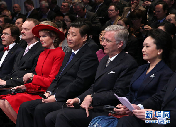 ????4月1日,國家主席習近平在比利時布魯日歐洲學院發(fā)表重要演講。這是在發(fā)表演講前,習近平和夫人彭麗媛在比利時國王菲利普和王后瑪?shù)贍柕碌呐阃略跁鼍妥?。新華社記者 龐興雷 攝