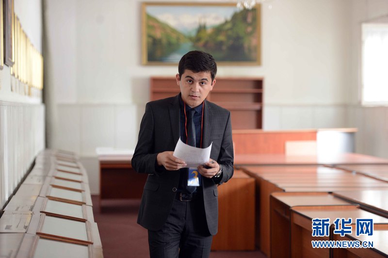 4月25日,烏茲別克斯坦塔什干國(guó)立東方學(xué)院大禮堂,世界經(jīng)濟(jì)與外交大學(xué)穆哈爾丁正在準(zhǔn)備參加比賽。