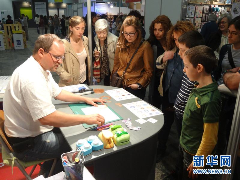 ????4月26日,巴塞羅那第一屆“手工藝品節(jié)”(Handmade Festival Barcelona)上,一些參展者向游客介紹如何進行手工制作。