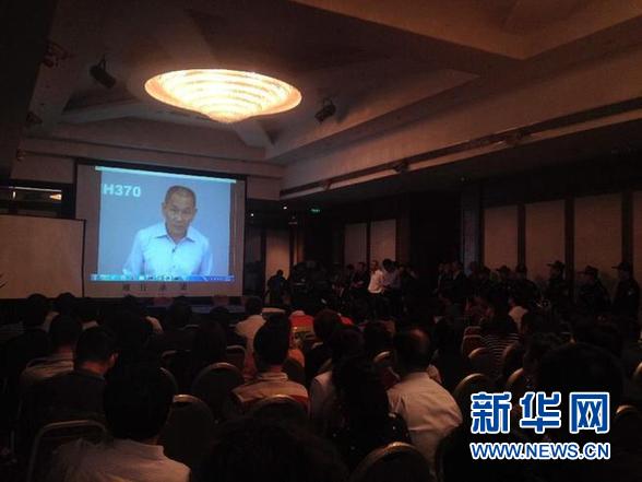5月1日,在北京麗都維景酒店,乘客家屬在收看馬來西亞航空公司首席執(zhí)行官葉海亞發(fā)表聲明的視頻連線。 新華社記者 沈伯韓 攝