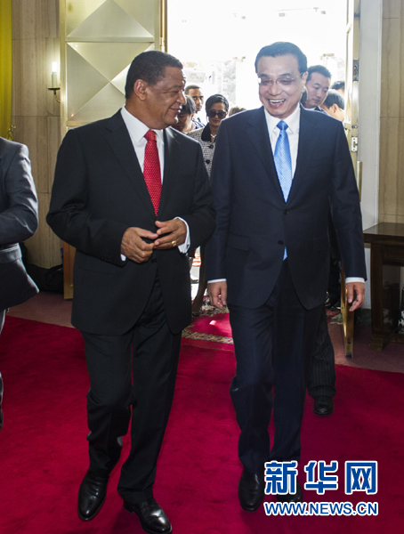 國務(wù)院總理李克強(qiáng)當(dāng)?shù)貢r(shí)間6日上午在亞的斯亞貝巴國家宮會(huì)見埃塞俄比亞總統(tǒng)穆拉圖。
