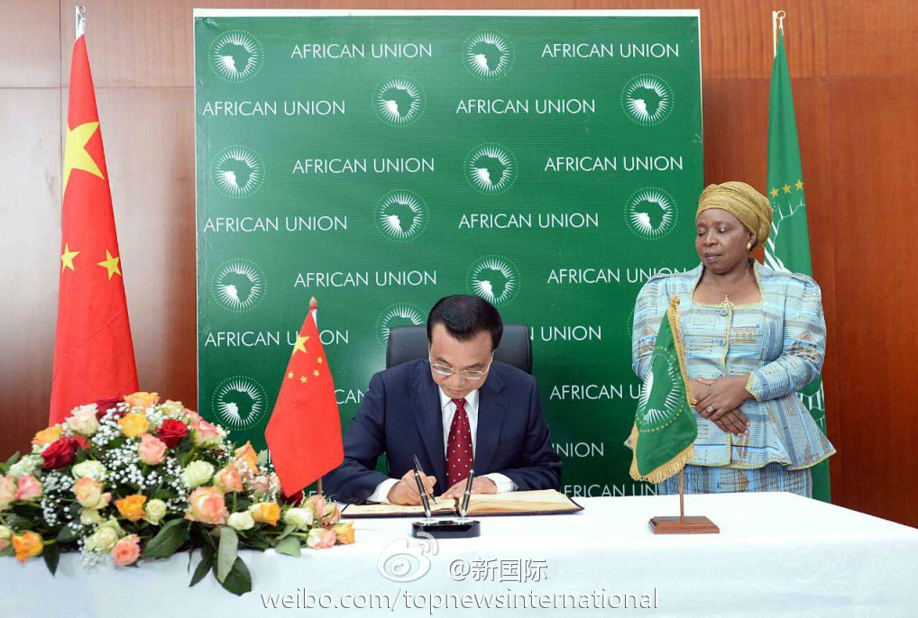 ????新華網(wǎng)北京5月6日電 據(jù)新華社“新國際”微博報(bào)道,5日上午,李克強(qiáng)在非盟委員會(huì)副主席姆溫查陪同下參觀了非盟會(huì)議中心。參觀結(jié)束后,應(yīng)非盟委員會(huì)主席祖馬邀請,李克強(qiáng)在貴賓簿上題詞。