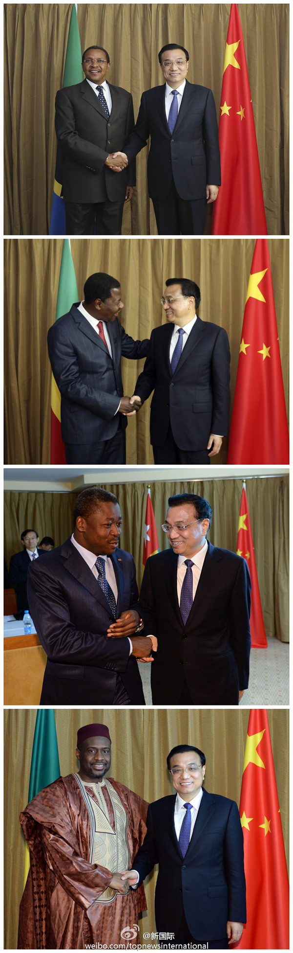 ????新華網(wǎng)北京5月8日電 據(jù)新華社“新國(guó)際”微博報(bào)道,李克強(qiáng)7日分別會(huì)見(jiàn)了出席第24屆世界經(jīng)濟(jì)論壇非洲峰會(huì)的坦桑尼亞、貝寧、多哥三國(guó)總統(tǒng)和馬里總理。會(huì)見(jiàn)中,四國(guó)領(lǐng)導(dǎo)人對(duì)李克強(qiáng)在非盟演講中提出的中非“461”合作框架表示高度贊同,稱其符合非洲人民的心愿,愿努力將其轉(zhuǎn)化為實(shí)實(shí)在在的成果。