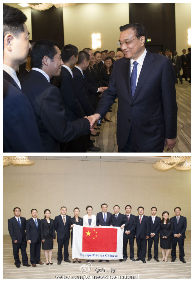 ??? 新華網(wǎng)北京5月9日電 據(jù)新華社“新國際”微博報(bào)道,8日,李克強(qiáng)總理在羅安達(dá)看望援安醫(yī)療隊(duì)?!坝惺裁蠢щy嗎?”李克強(qiáng)與隊(duì)員一一握手,詢問工作情況。得知隊(duì)員最大的困難是語言,李克強(qiáng)鼓勵(lì)大家說,辦法總比困難多,雖然語言溝通有障礙,但可以用心靈感受對方疾苦,讓對方切身感受到中國人民的美好情誼。?