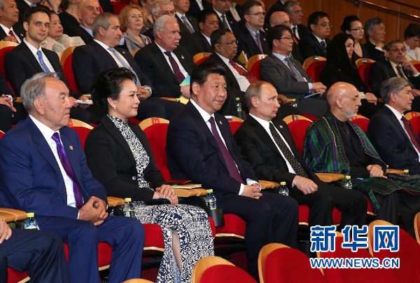 ??? 5月20日,國家主席習近平在上海國際會議中心舉行宴會,代表中國政府和人民,歡迎前來出席亞洲相互協(xié)作與信任措施會議第四次峰會的各國貴賓。歡迎宴會后,“團結和諧的亞洲-攜手向明天”-亞洲相互協(xié)作與信任措施會議第四次峰會文藝晚會在上海大劇院舉行。這是習近平和彭麗媛同與會各國貴賓共同觀看文藝晚會。新華社記者 龐興雷 攝
