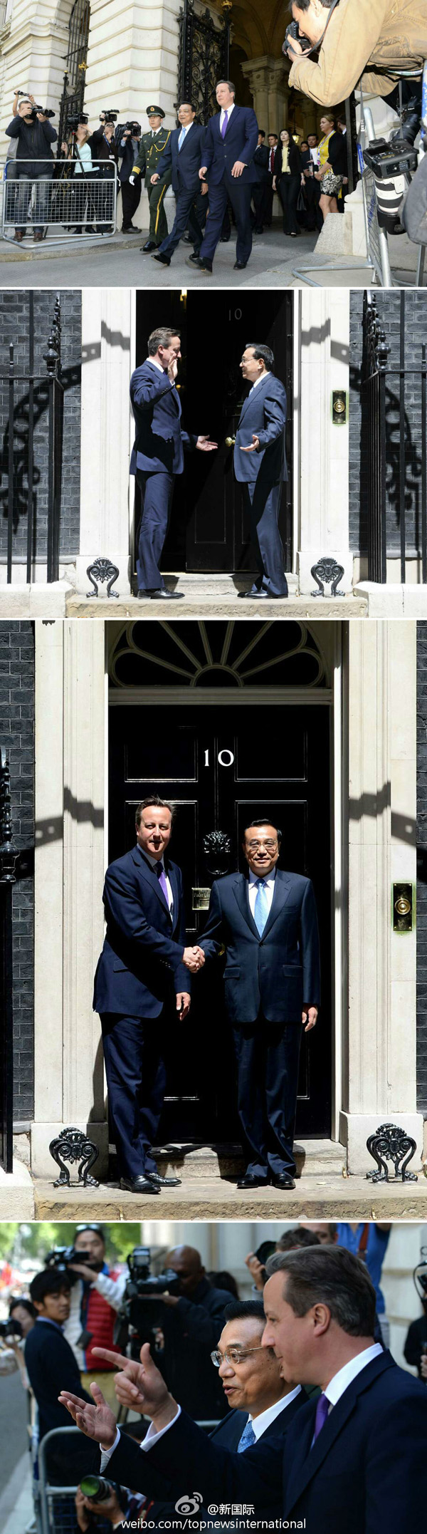 新華網(wǎng)北京6月17日電 據(jù)新華社“新國際”微博報(bào)道,17日,英國首相府所在的唐寧街附近五星紅旗飄揚(yáng),卡梅倫為到訪的李克強(qiáng)總理舉行隆重歡迎儀式。隨后,兩位領(lǐng)導(dǎo)人步行來到首相官邸。面對(duì)中外記者的鏡頭,李克強(qiáng)與卡梅倫握手合影,愉快交談。在首相府一層內(nèi)閣會(huì)議室內(nèi),兩位領(lǐng)導(dǎo)人就雙邊關(guān)系和共同關(guān)心的問題舉行會(huì)談。