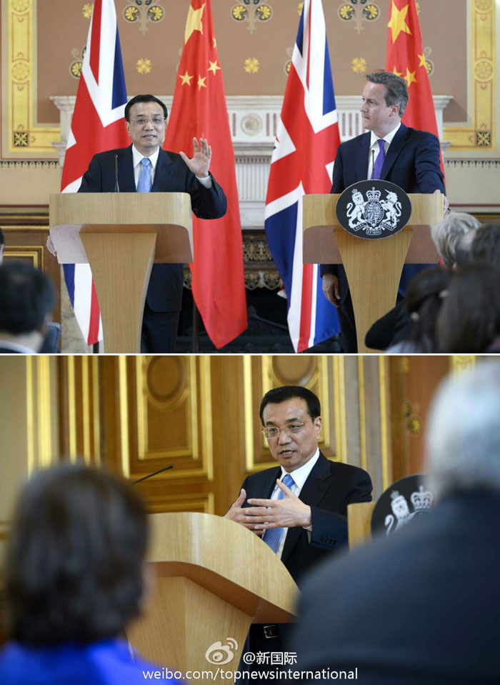 ??? 新華網(wǎng)北京6月18日電 據(jù)新華社“新國(guó)際”微博報(bào)道,17日,李克強(qiáng)與卡梅倫共見記者。李克強(qiáng)說,中英共同設(shè)立總額2億英鎊的科學(xué)基金,以加強(qiáng)聯(lián)合科學(xué)創(chuàng)新合作,第一個(gè)合作項(xiàng)目就是太空項(xiàng)目,這顯示了“我們合作的雄心”。未來5年中國(guó)將向英派遣1萬(wàn)名公費(fèi)留學(xué)生,也歡迎英國(guó)向中國(guó)派遣更多留學(xué)生。