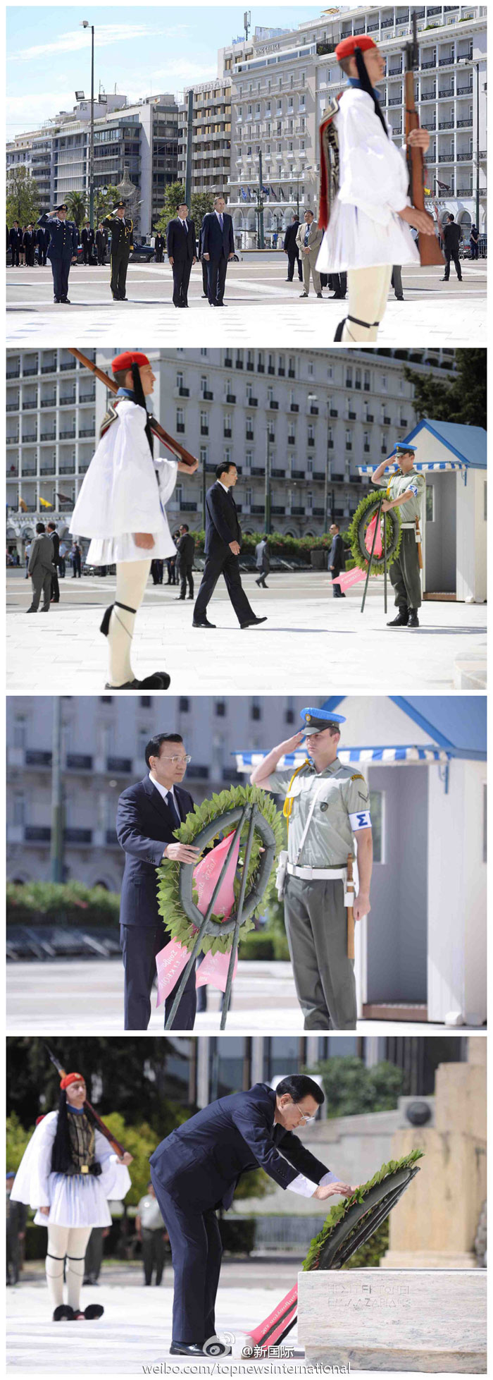 ??? 新華網(wǎng)北京6月20日電 據(jù)新華社“新國(guó)際”微博報(bào)道,正在希臘訪問(wèn)的李克強(qiáng)總理19日向希臘無(wú)名戰(zhàn)士紀(jì)念碑獻(xiàn)花圈。該紀(jì)念碑1932年建成,碑上鐫刻公元前5世紀(jì)希臘政治家伯里克利斯一篇悼詞中的兩句名言:“全世界杰出戰(zhàn)士之墓”、“安放無(wú)名氏的床第”,及希臘從上世紀(jì)初到五十年代與外國(guó)交戰(zhàn)的戰(zhàn)役名稱和地名。