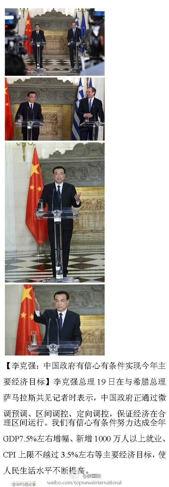 ??? 新華網(wǎng)北京6月20日電 據(jù)新華社“新國際”微博報道,李克強總理19日在與希臘總理薩馬拉斯共見記者時表示,中國政府正通過微調(diào)預(yù)調(diào)、區(qū)間調(diào)控、定向調(diào)控,保證經(jīng)濟在合理區(qū)間運行。
