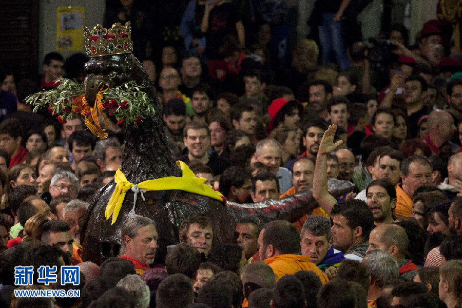 西班牙貝爾加(Berga)市的La Patum節(jié)上,頭戴皇冠的老鷹玩偶穿過(guò)狂歡的人群。