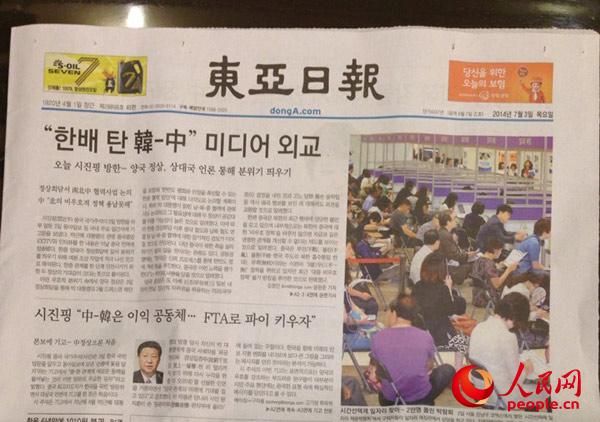 ??? 韓國《東亞日報》在頭版顯著位置刊發(fā)習近平主席署名文章《加快自貿區(qū)談判進程 做大利益蛋糕》金慧廷 攝