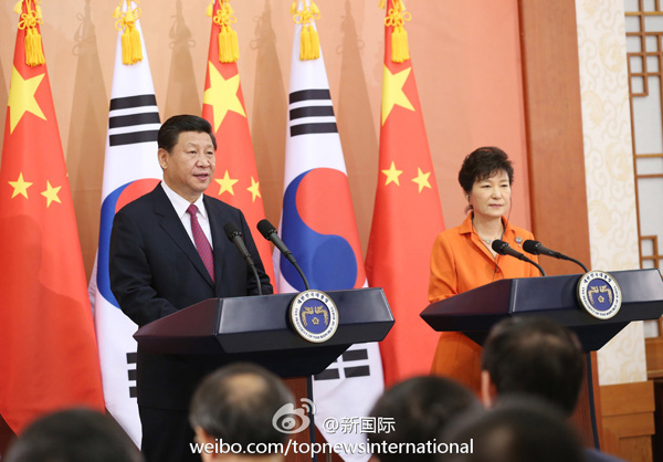 ??? 新華網(wǎng)北京7月4日電 據(jù)新華社“新國(guó)際”微博報(bào)道,習(xí)近平主席3日在同韓國(guó)總統(tǒng)樸槿惠會(huì)談后共見記者時(shí)說(shuō),我和樸槿惠總統(tǒng)都認(rèn)為,中韓兩國(guó)應(yīng)一道努力,成為實(shí)現(xiàn)共同發(fā)展的伙伴、致力地區(qū)和平的伙伴、攜手振興亞洲的伙伴、促進(jìn)世界繁榮的伙伴。