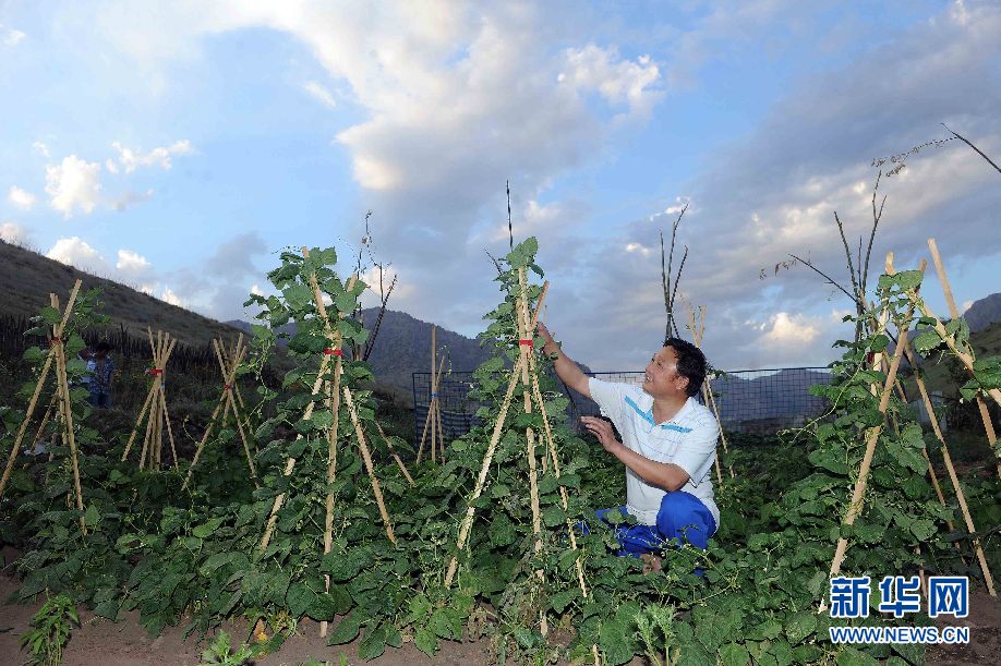 ????7月5日,烏茲別克斯坦安革連至琶布鐵路隧道項(xiàng)目安革連隧道進(jìn)口西口分部生活區(qū),杜潮停在菜地查看豆角長勢。(沙達(dá)提 攝)