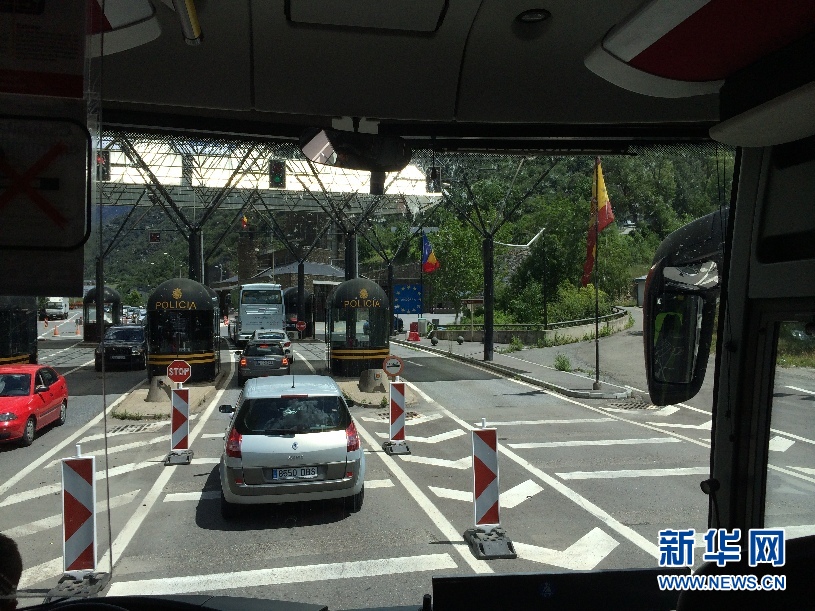 ????大巴車(chē)在西班牙和安道爾兩國(guó)邊境處等待進(jìn)入安道爾。(周喆 攝)