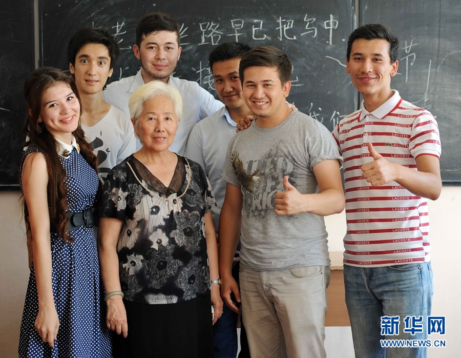 ??? 6月25日,烏茲別克斯坦首都塔什干,烏國(guó)立世界語(yǔ)言大學(xué)教室,70歲的董富華在向三年級(jí)學(xué)生上漢語(yǔ)課。新華網(wǎng)記者 沙達(dá)提攝。