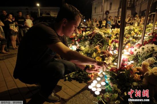 資料圖:7月17日,烏克蘭基輔,民眾們手持鮮花和蠟燭在荷蘭駐烏大使館前悼念馬航MH17事故遇難者。據(jù)稱,該架飛機(jī)上所載人數(shù)為298人,而此前報道稱飛機(jī)上共載295人。由于此次事件可能導(dǎo)致地面人員傷亡,總共的遇難人數(shù)將超過300人。
