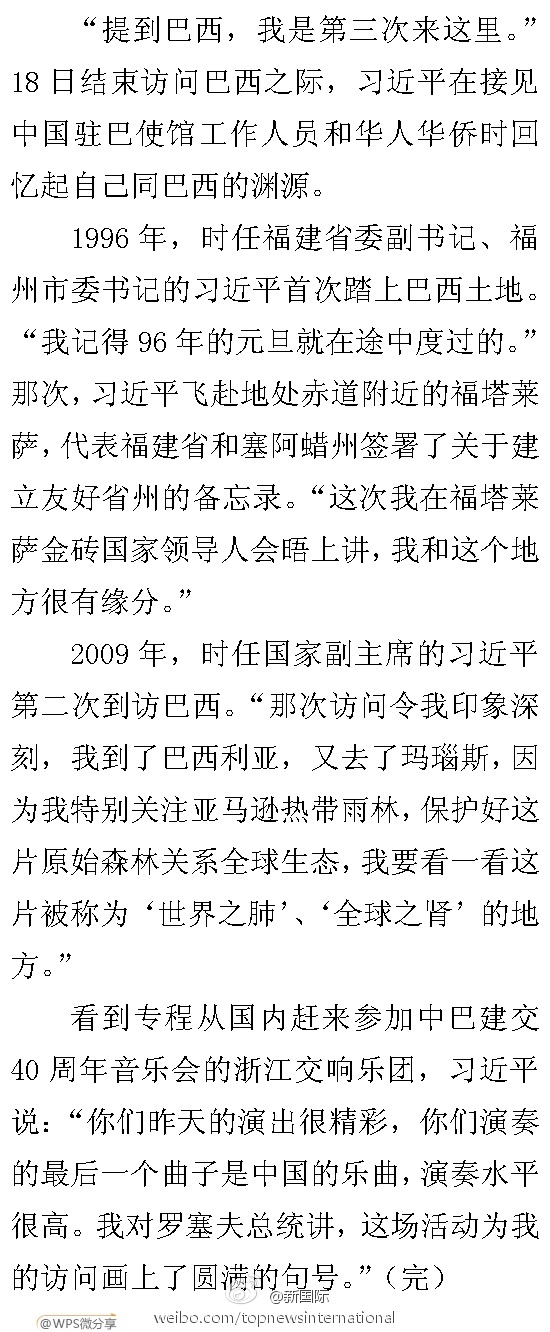 新華網(wǎng)北京7月19日電? 據(jù)新華社“新國際”微博報道,“提到巴西,我是第三次來這里?!?8日結(jié)束訪問巴西之際,習近平在接見中國駐巴使館工作人員和華人華僑時回憶起自己同巴西的淵源。