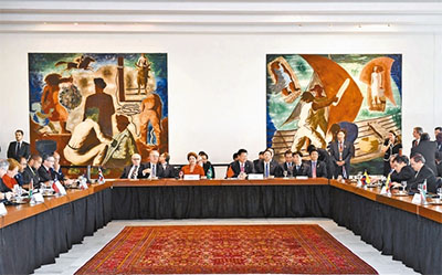 會(huì)晤開始前,習(xí)近平與羅塞夫共同迎接出席會(huì)晤的拉美和加勒比國(guó)家領(lǐng)導(dǎo)人和代表,同他們一一握手并集體合影。