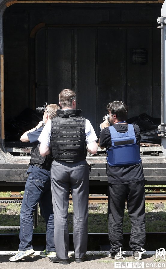 當?shù)貢r間2014年7月20日,烏克蘭頓涅茨克Torez,馬航墜機遇難乘客遺體被裝上列車冷藏車廂將被運走。載有部分遺體的火車從距空難現(xiàn)場不遠的烏克蘭托列茲市出發(fā),前往頓涅茨克市?;疖囯x站前,身處空難現(xiàn)場的歐洲安全與合作組織(歐安組織)代表檢查了運載遺體的5節(jié)冷藏車廂。