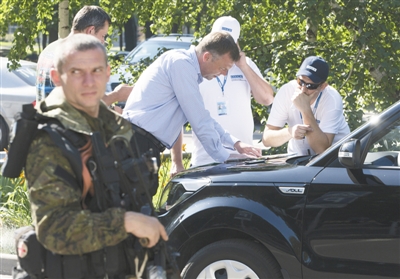 7月30日,烏克蘭頓涅茨克,歐安組織調查人員看地圖分析周圍安全形勢。由于烏內(nèi)戰(zhàn)仍在繼續(xù),調查人員已經(jīng)連續(xù)4天未能進入MH17墜機現(xiàn)場。