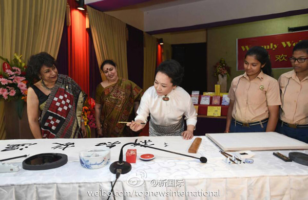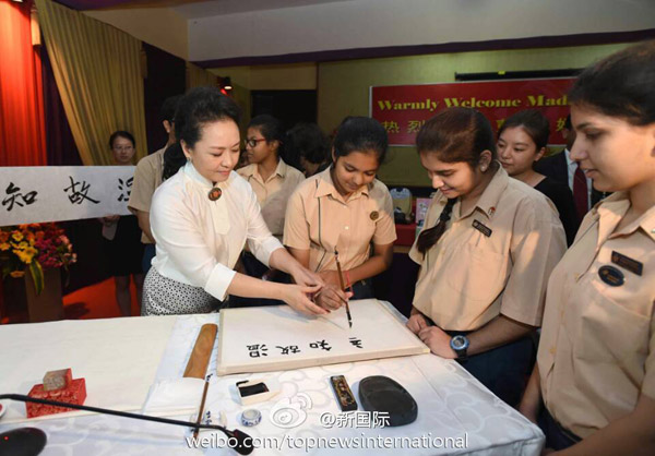 ????新華網(wǎng)北京9月18日電 據(jù)新華社“新國際”微博報道,習(xí)近平主席夫人彭麗媛18日上午在新德里參觀泰戈爾國際學(xué)校時,用毛筆書寫成語“溫故知新”,并簽名蓋上印章。她對師生們逐字講解后說,我們要經(jīng)常溫習(xí)學(xué)過的知識,不斷學(xué)習(xí)掌握新知識,開拓創(chuàng)新,與時俱進。希望同學(xué)們認真學(xué)習(xí),更好報效祖國,祝你們成功。