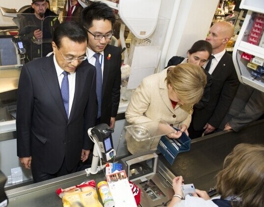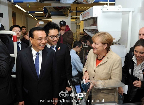 兩人繼續(xù)往前走。默克爾不時(shí)停下來(lái)向超市里的顧客介紹說(shuō),這是中國(guó)的總理。聽(tīng)到一位顧客用中文向他問(wèn)好,李克強(qiáng)總理停下來(lái)與他握手,并問(wèn)他:“你會(huì)講中文?”這位小伙子說(shuō),他會(huì)講,問(wèn)道:“你是李克強(qiáng)?”李總理笑著對(duì)他說(shuō)是,稱贊他中文很好。