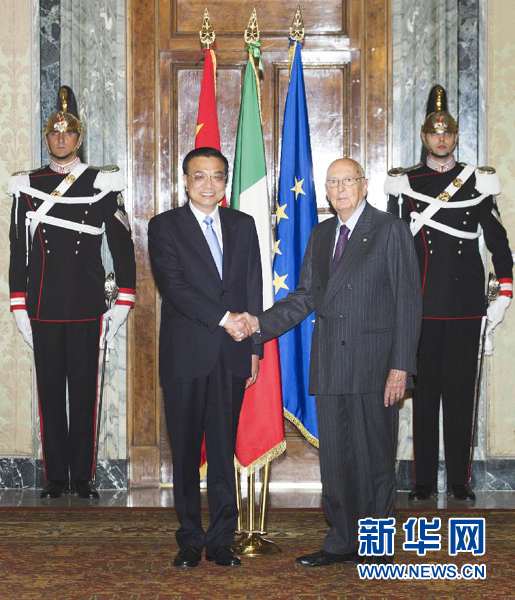 10月14日,國(guó)務(wù)院總理李克強(qiáng)在羅馬總統(tǒng)府會(huì)見(jiàn)意大利總統(tǒng)納波利塔諾。 新華社記者 謝環(huán)馳 攝