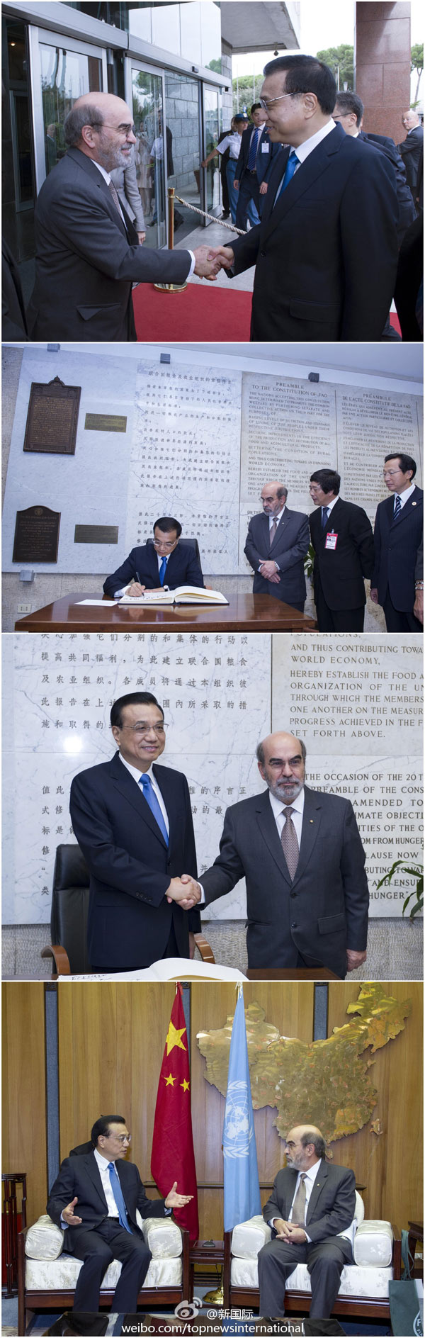 ????新華網(wǎng)北京10月15日電 據(jù)新華社“新國際”微博報道,應聯(lián)合國糧農(nóng)組織總干事格拉齊亞諾的邀請,李克強總理在世界糧食日前夕,來到位于羅馬的糧農(nóng)組織總部訪問,與格拉齊亞諾會見并發(fā)表演講。這是李克強就任總理后首訪聯(lián)合國組織,也是中國總理首次訪問糧農(nóng)組織總部。