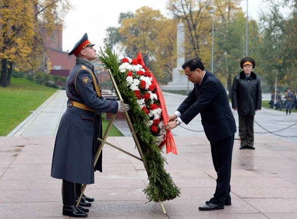 ??? 俄方為李克強(qiáng)總理安排的第一場正式活動就是向克里姆林宮外的無名烈士墓獻(xiàn)花圈,意涵豐富深刻。