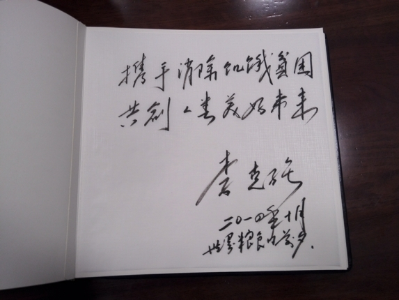 ????石板前面擺放著一張簽字桌,桌上放著一本叫做golden book(金書)的簽到簿,是專供到訪的國家領(lǐng)導(dǎo)人用的??藦?qiáng)總理在上面寫下了這樣一句話“攜手消除饑餓貧困 共創(chuàng)人類美好未來”。