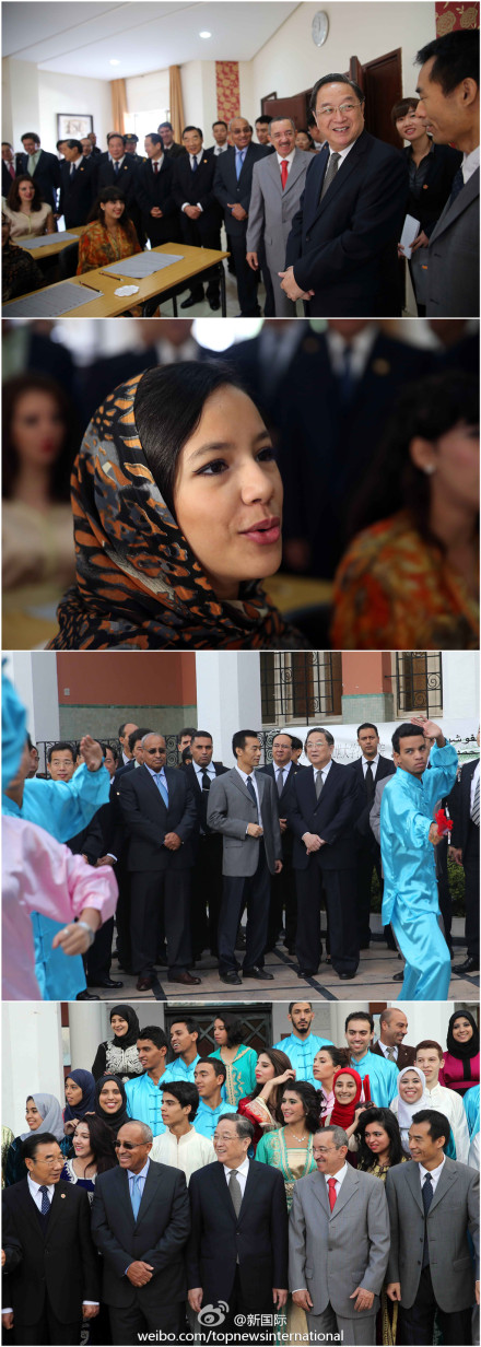 ??? 新華網(wǎng)北京11月6日電 據(jù)新華社“新國際”微博報道,全國政協(xié)主席俞正聲5日參觀摩洛哥穆罕默德五世大學(xué)孔子學(xué)院,身著摩中兩國民族服裝的當(dāng)?shù)貙W(xué)生誦唐詩、打太極、跳《小蘋果》歡迎。俞正聲走進(jìn)課堂對學(xué)生說:“你們是中摩友好的未來。希望大家用心學(xué)好中文,促進(jìn)合作交流?!?(記者李拯宇 攝影劉衛(wèi)兵)