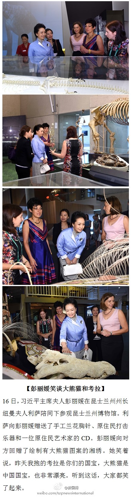 ????新華網(wǎng)北京11月16日電 據(jù)新華社“新國際”微博報道,16日,習近平主席夫人彭麗媛在澳大利亞昆士蘭州州長紐曼夫人利薩陪同下參觀昆士蘭州博物館。