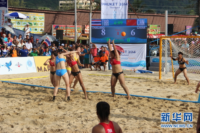 ??? 11月16日,中國沙灘手球運(yùn)動員宮艷(左二)在比賽中擲球瞬間。中國體育代表團(tuán)16日在泰國普吉舉行的第四屆亞洲沙灘運(yùn)動會上勇奪2枚金牌和2枚銅牌。當(dāng)天比賽全部結(jié)束時,中國隊(duì)以3金2銀5銅的成績暫列獎牌榜第五。新華社發(fā)(塔納攝)